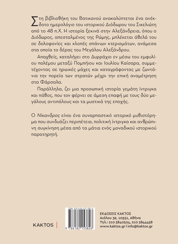 Μέσα από τη συγγραφή του Νίκανδρου, προσπάθησα να ξαναδώ τον κόσμο του 1ου αιώνα π.Χ. όχι ως απλό παρατηρητής, αλλά σαν κάποιος που ζει εκεί — που περπατά στα σοκάκια της Αλεξάνδρειας, ακούει τη βουή της Ρώμης και παρακολουθεί τη σύγκρουση δύο κόσμων: του Πομπήιου και του Ιουλίου Καίσαρα.